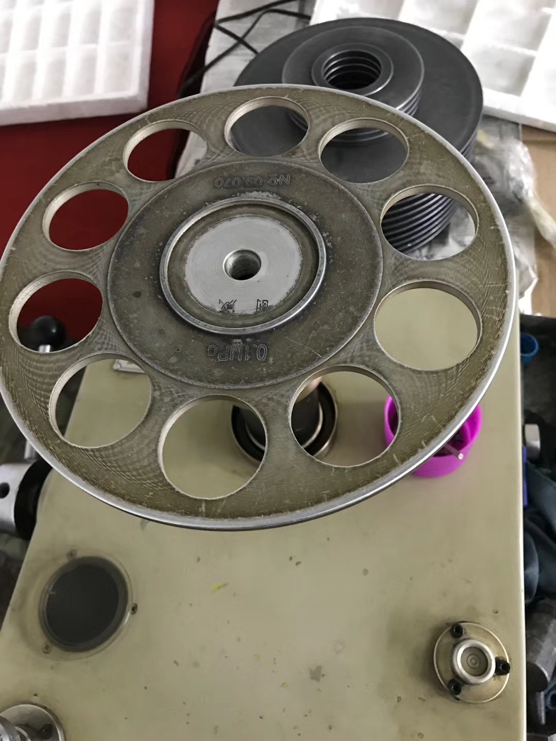 銷售人員走訪客戶,維護創威第一代活塞式壓力計,2009年的設備目前還能正常使用。